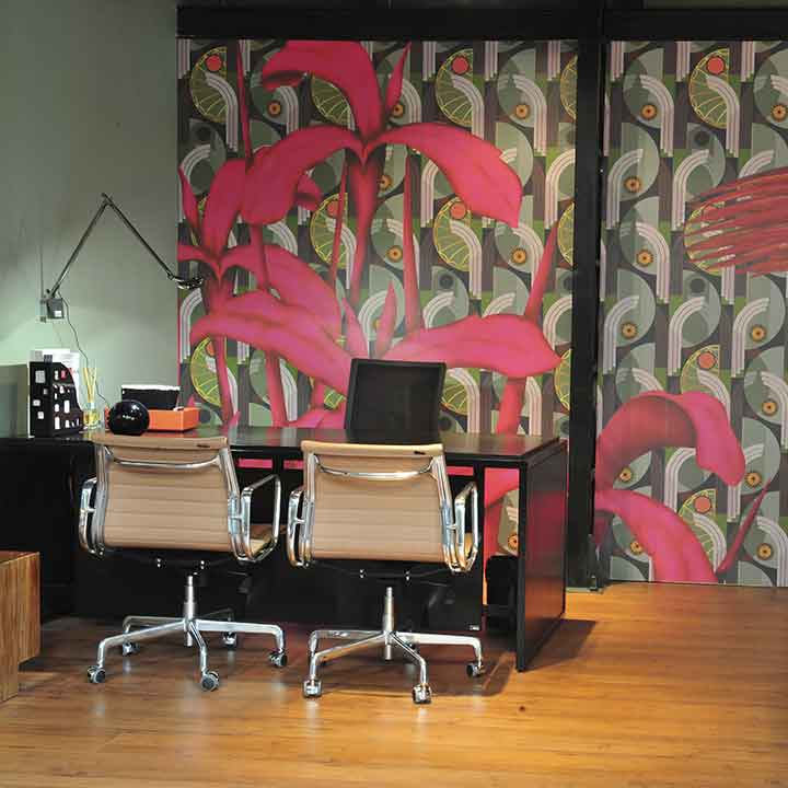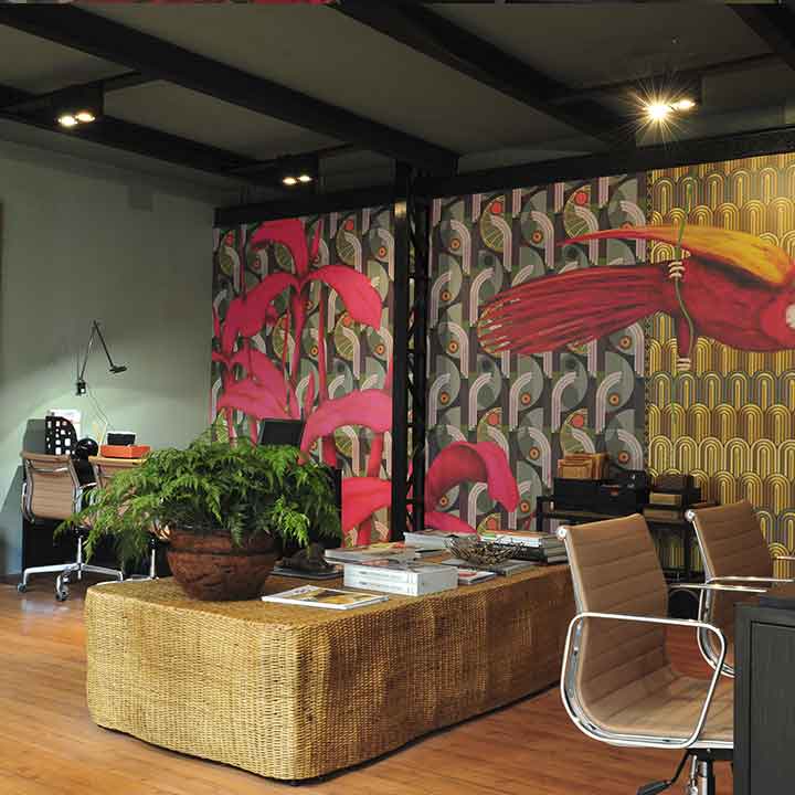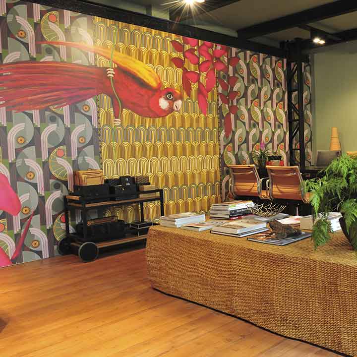 Projeto orientado à experiência, onde a integração entre arte e espaço constrói uma ambientação imersiva, mantendo funcionalidade e organização sem comprometer a força da identidade visual.