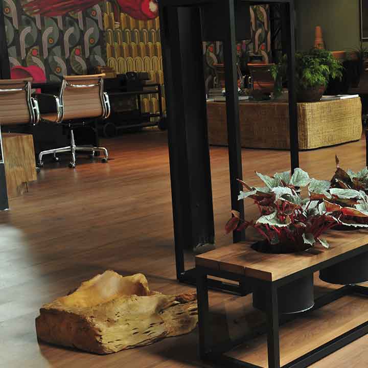 Combinação de madeira, metal e elementos naturais para balancear a intensidade visual.