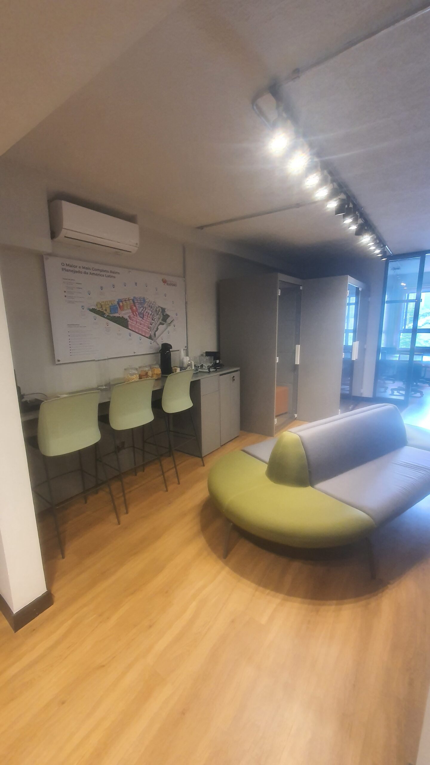 - Separação entre áreas abertas e salas privativas